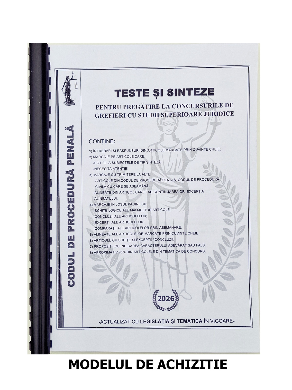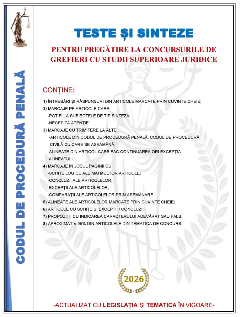 -este adaptat strict cu tematica în vigoare pentru concursurile de grefieri (direct pe post și S.N.G.) cu studii superioare juridice;