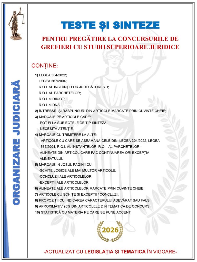 -este adaptat strict cu tematica în vigoare pentru concursurile de grefieri (direct pe post și SNG) cu studii superioare juridice;